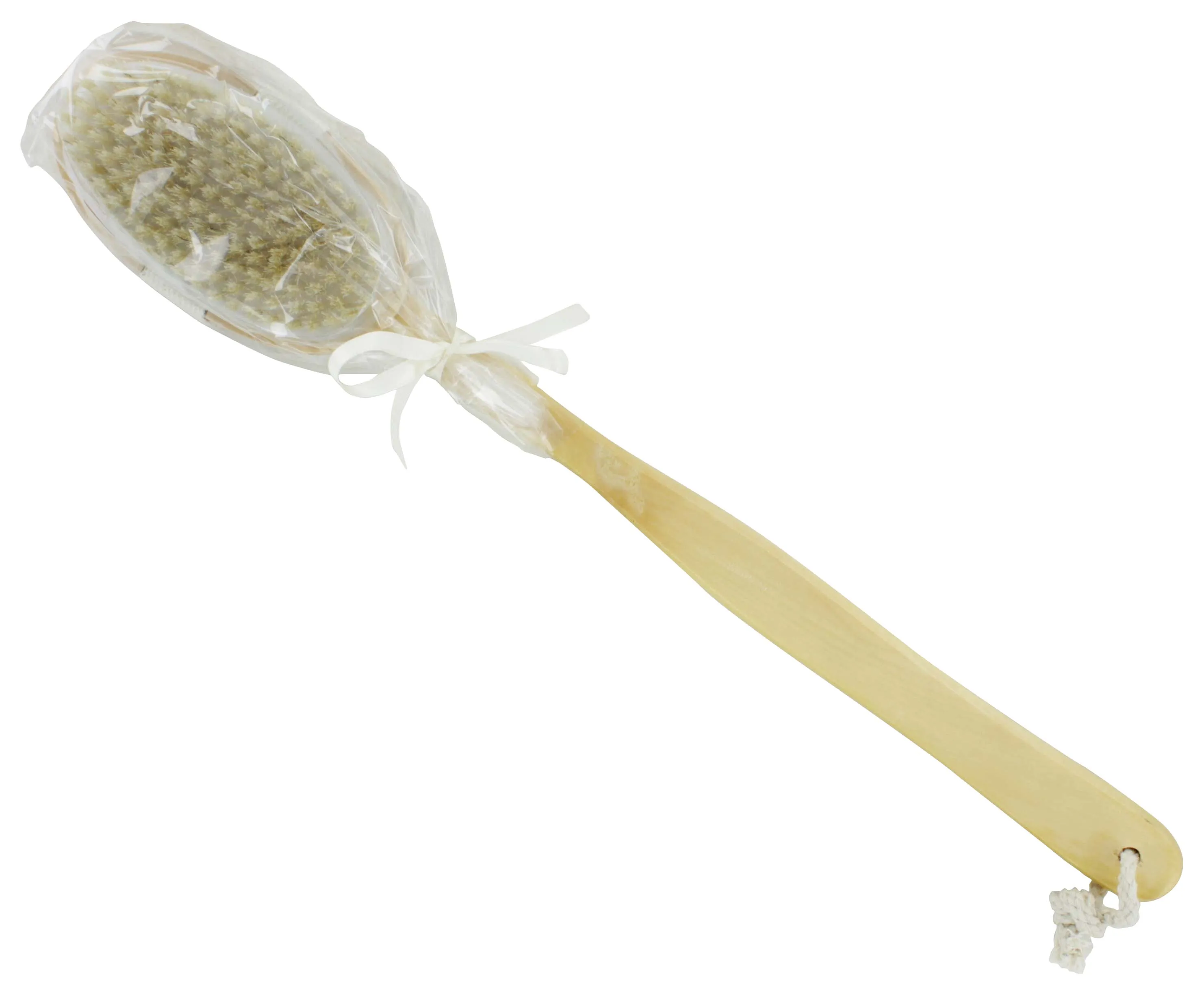 Long handled bath brush with natural bristles.