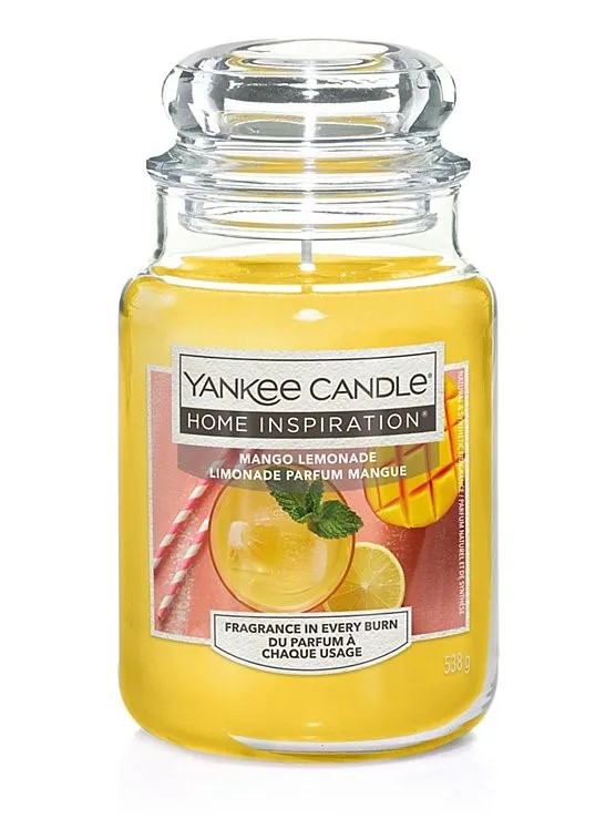 Bring summer vibes indoors with the Yankee Candle Home Inspiration Mango Lemonade. This large jar candle blends juicy mango with zesty lemon for a sweet, refreshing, and uplifting fragrance.