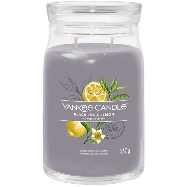 Yankee Candle Signature Black Tea & Lemon 567g Candle combines rich black tea notes with bright lemon for a refreshing and uplifting fragrance. Made with a premium wax blend, it provides a clean, even burn and long-lasting scent for your home.
