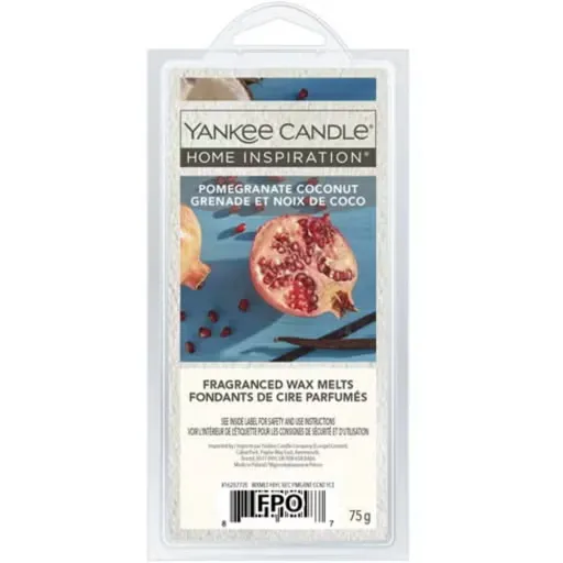 A scented wax melt with a fruity pomegranate and coconut fragrance, designed to create a warm and refreshing atmosphere in your home. Easy to use with a wax burner for a long-lasting scent experience.