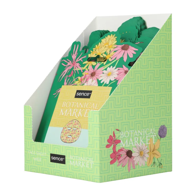 Printed tissue face mask with a green botanical design, formulated to hydrate and revitalise the skin while offering a relaxing skincare experience.