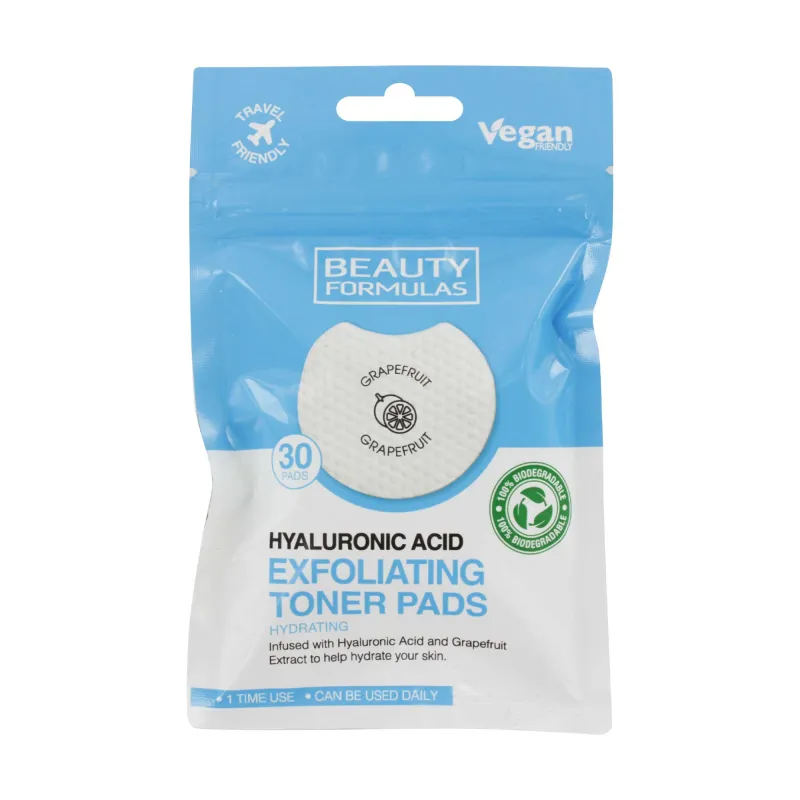 Jar containing 30 exfoliating toner pads infused with hyaluronic acid to gently remove dead skin cells while hydrating and refreshing the complexion.