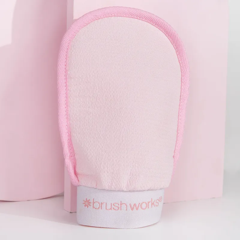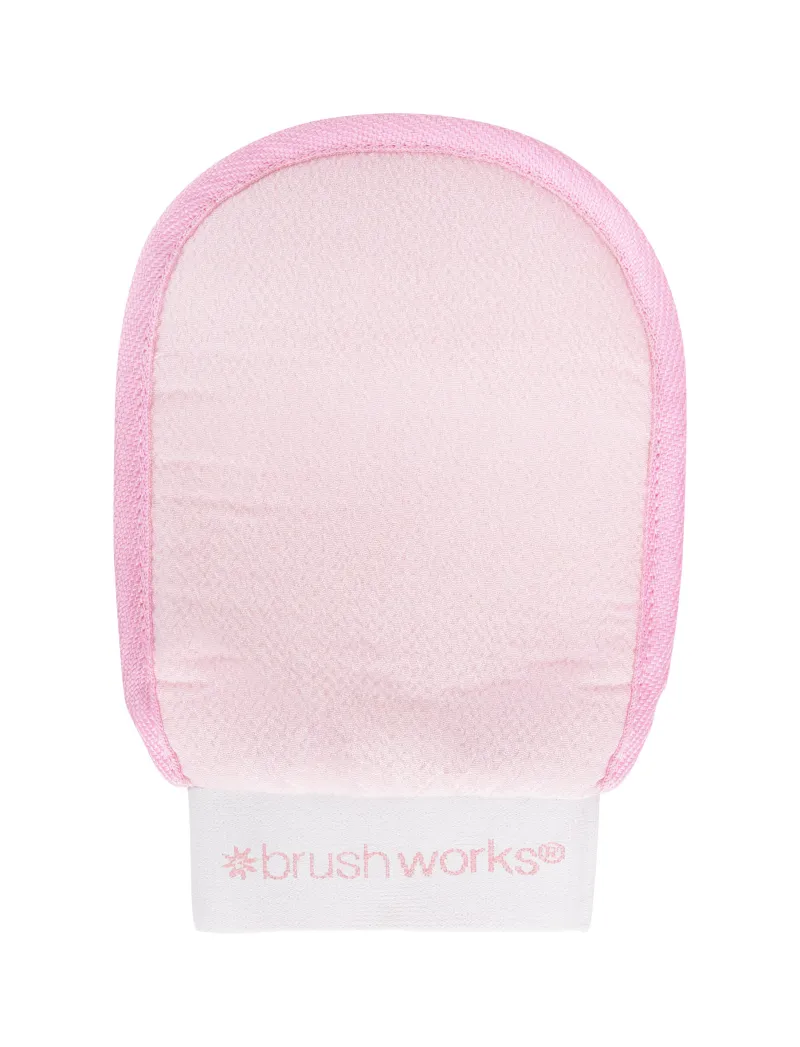 Brush Works Tan Removal Mitt is a gentle, textured mitt designed to effectively exfoliate and remove self-tan for smooth, refreshed skin.