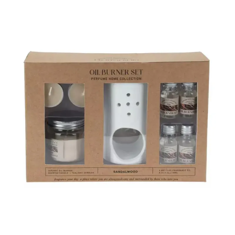 The Basics Aroma Set includes a white ceramic fragrance burner, four 10ml bottles of sandalwood-scented oil, two 12g tealight candles, and one 60g jar candle. This set is designed to create a cozy and relaxing atmosphere in your home, making it ideal for unwinding after a long day or enhancing the ambiance during gatherings. The compact size and elegant design also make it a thoughtful gift option.