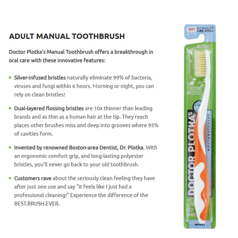 Dr. Plotka’s Mouthwatchers Adult Toothbrush features revolutionary silver-infused bristles that naturally eliminate bacteria and provide superior cleaning between teeth and gums. Designed with ultra-fine flossing bristles to remove plaque and promote oral health, it’s ideal for daily use and gentle on enamel. Supplied in a bulk pack of 20 — perfect for clinics, retailers, or family use.