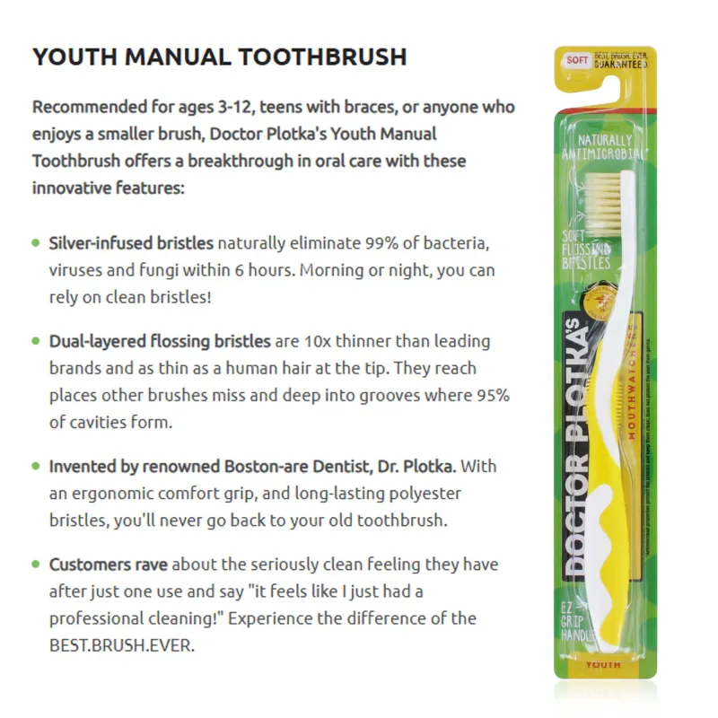 Dr. Plotka’s Mouthwatchers Kiddy Toothbrush is specially designed for children, featuring soft, silver-infused bristles that naturally eliminate bacteria and keep the brush cleaner for longer. The ultra-fine flossing bristles reach where other brushes can’t, ensuring a deep yet gentle clean for young teeth and gums. Supplied in a convenient bulk pack of 20 — perfect for schools, clinics, or family use.