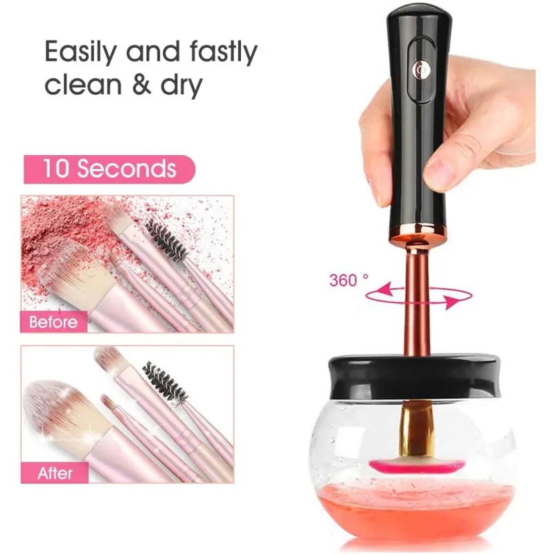 Automatic brush cleaner designed to quickly clean and dry makeup brushes.
