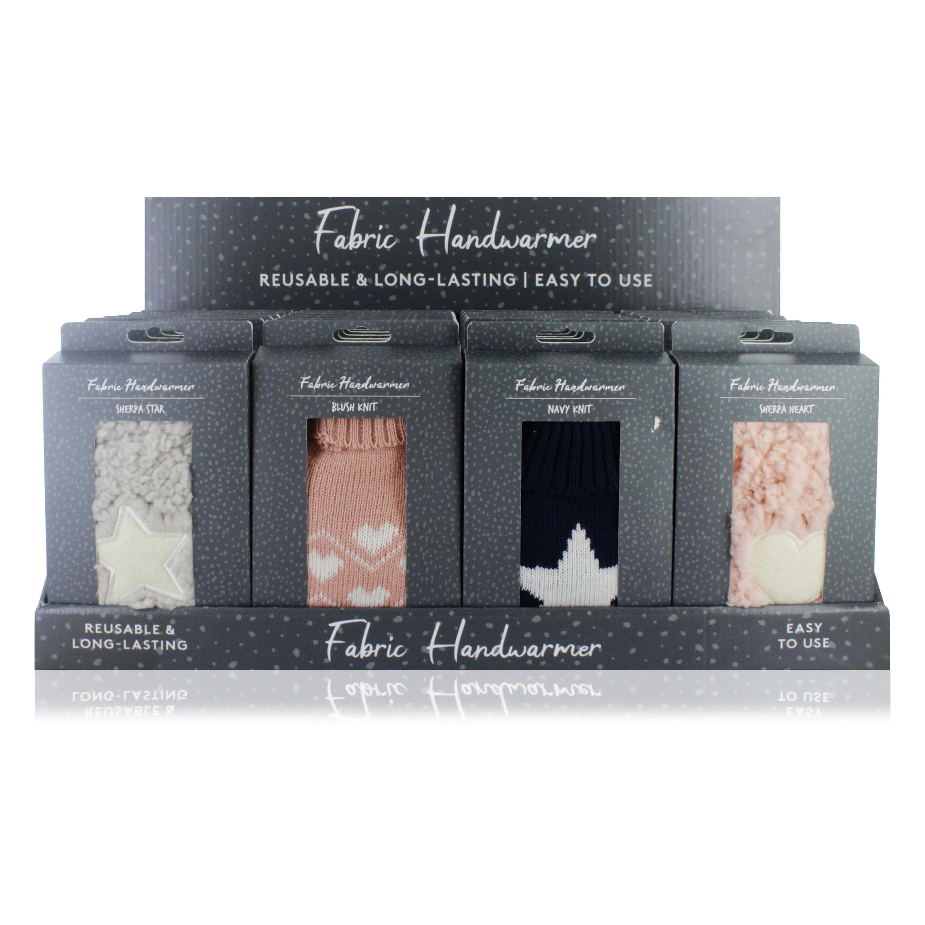 A cosy fabric hand warmer display unit containing 24 reusable hand warmers. Perfect for cold weather, outdoor use, or seasonal gifting, providing instant warmth and comfort.