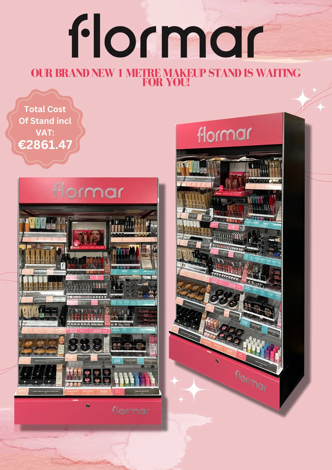 A 1-meter wall display stand designed for showcasing Flormar beauty products in a sleek, organized presentation.