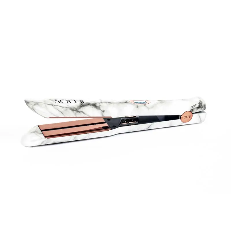 A premium infrared flat iron with a sleek marble design, featuring infrared heat technology to smooth, shine, and protect hair from heat damage.